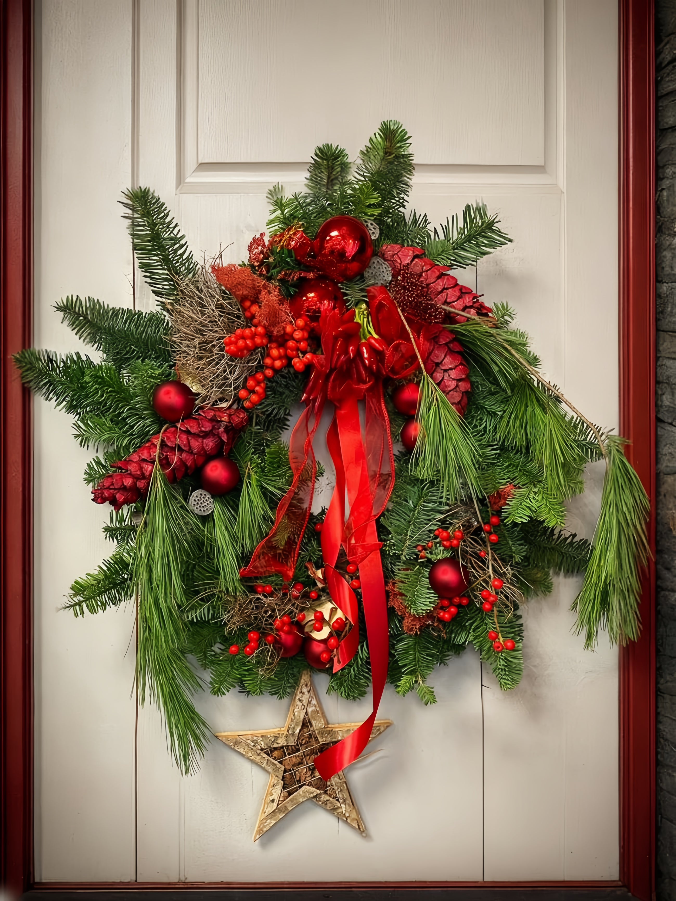 Red Festive Wreath Please note: for seasonal and other supply reasons, we may occasionally substitute some of the blooms shown in the image. We will always try to be true to the bouquet's colour coordination, style, and shape and guarantee to give you the full value paid. If you have any...